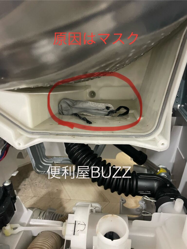 どうやらポケットに入っていたマスクがそのまま洗濯槽へ入り、脱水の勢いで排水経路に流れ込んだようです。